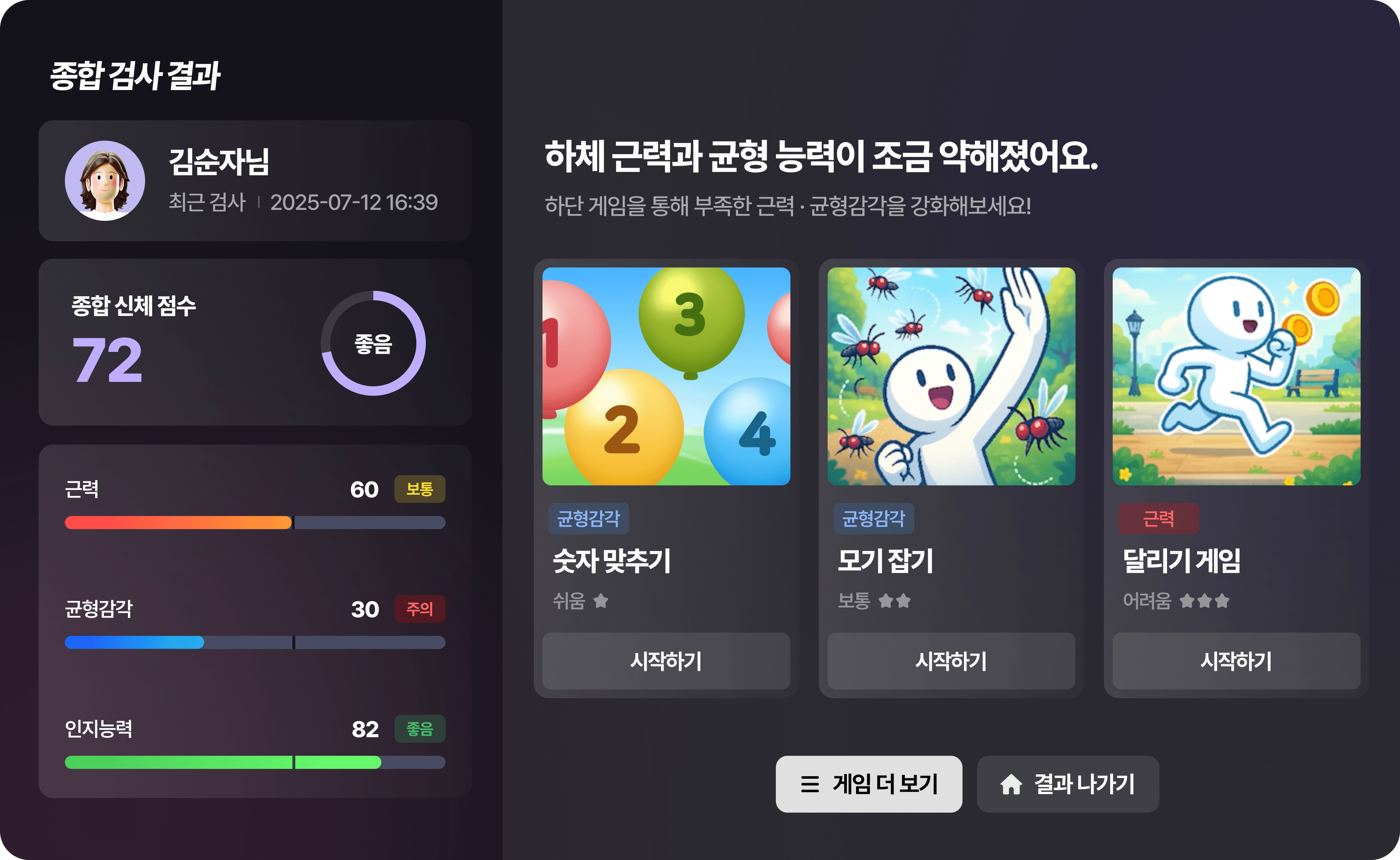 고령자의 움직임을 실시간으로 분석하고, 낙상 위험도를 평가해 개인 맞춤형 운동을 게임 형식으로 제공합니다.